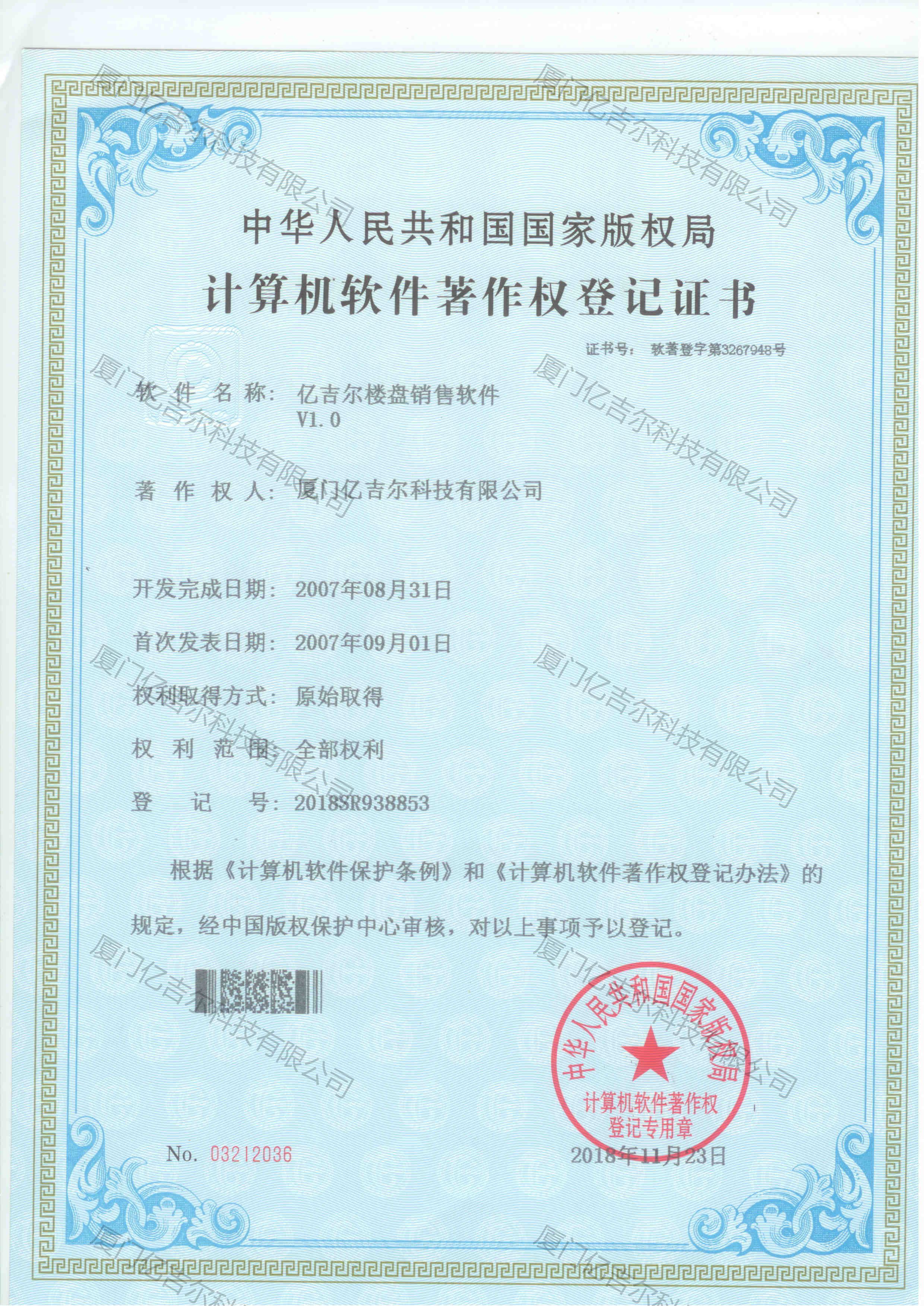 億吉爾樓盤(pán)著作權(quán)登記證書(shū) 發(fā)布日期:2018年11月23日 瀏覽次數(shù):3907 關(guān)鍵字: 公司 1/1億吉爾樓盤(pán)軟件著作權(quán)登記證書(shū)